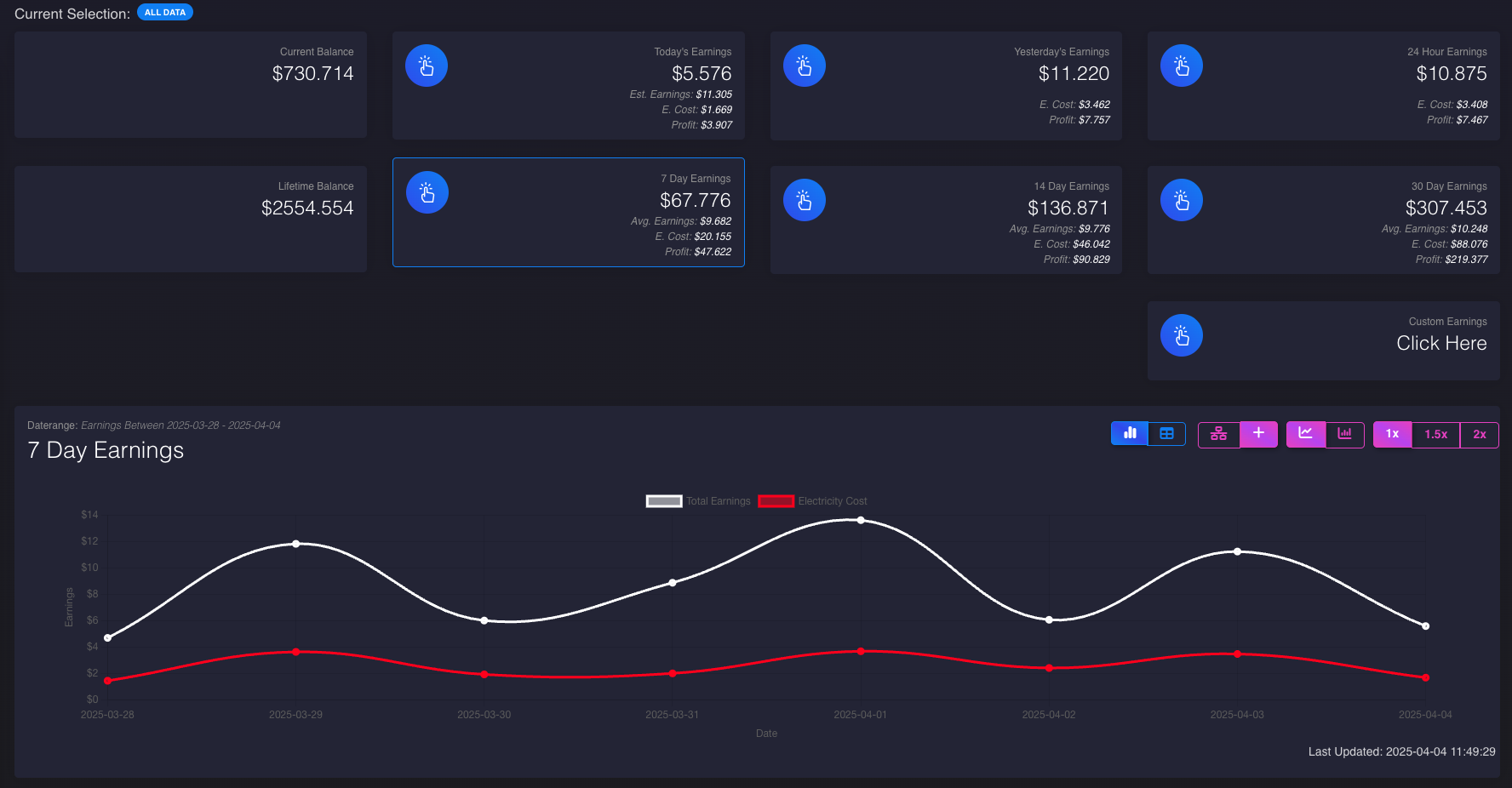 - Profit Tracking - Real-time profit calculations (earnings minus electricity costs)
